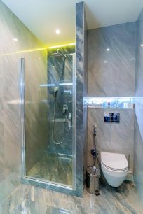 - Собственная ванная комната, оборудованная душевой кабиной, туалетом, гигиеническим душем, косметическим зеркалом и феном;
