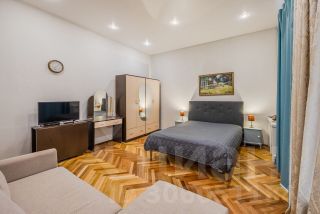 Квартира с 1 полноценной спальней и собственной кухней располагается на 5-м этаже 5-этажного дома (работает лифт), окна и балкон выходят в тихий двор. Подходит для размещения до 4 человек: двуспальная кровать и раскладывающийся двуспальный диван. Постельное белье готовится из расчета 2+2 (два двуспальных комплекта).