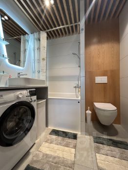 В квартире есть все необходимое для комфортного проживания. Просторная кухня- гостиная и уютная спальня обставлены современной мебелью. Кухня полностью оборудована: здесь есть холодильник, посудомоечная машина и стиральная машина. В ванной комнате установлена ванна. Также в квартире есть телевизор и доступ к интернету. Одним из преимуществ является наличие лоджии, где можно наслаждаться утренним кофе или вечерними видами.