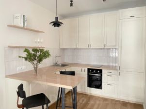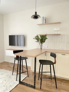 В кухне-гостиной установлен новый кухонный гарнитур с духовым шкафом, варочной панелью на 2 конфорки, вытяжкой, встроенным холодильником и посудомойкой. Также на кухне установлен двойной смеситель с фильтрованной питьевой водой. Столовая группа с двумя полубарными стульями.