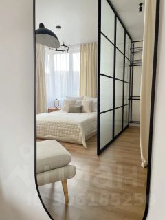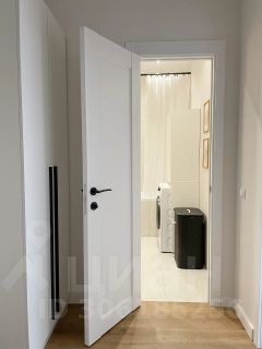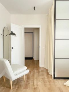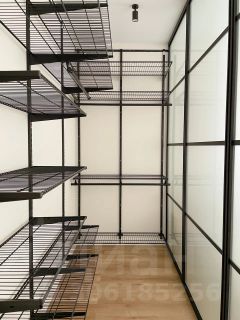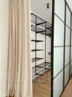 В спальне также расположилась просторная гардеробная, которая отделена стеклянной перегородкой с матовым стеклом. Дополнительное место хранения также предусмотрено в прихожей.