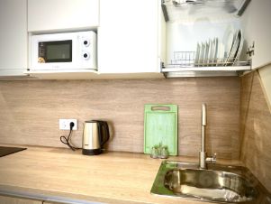 * Кухонный уголок: плита, холодильник, СВЧ, чайник, посуда