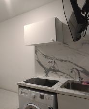 Встроенная кухня, стиральная машина, холодильник, э/чайник, кухонный гарнитур, индукционная плита, вплоть до посуды.
