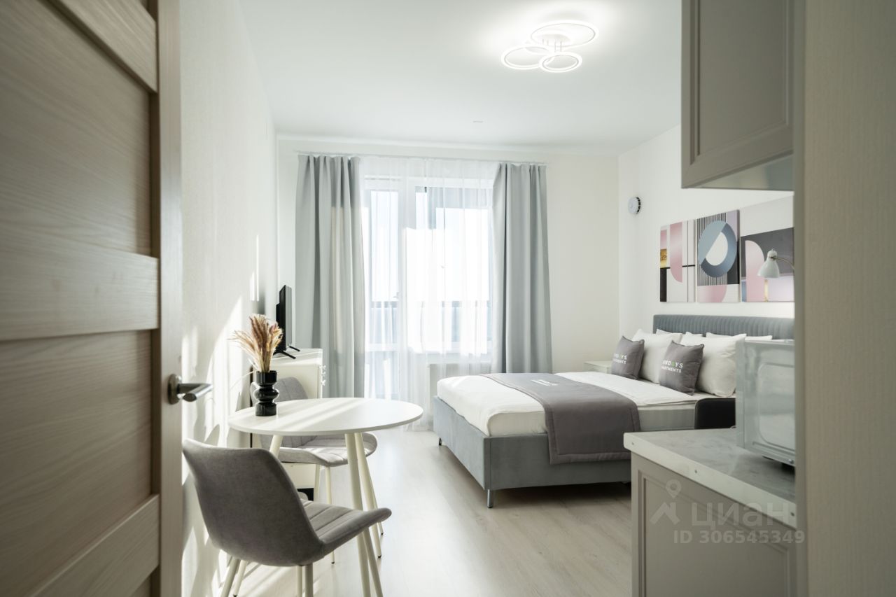 Студия для посуточной аренды расположена по адресу: Санкт-Петербург, проспект Авиаконструкторов, д. 69, ЖК Чистое небо.