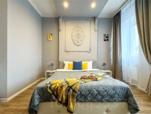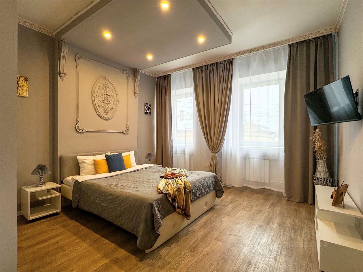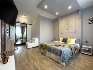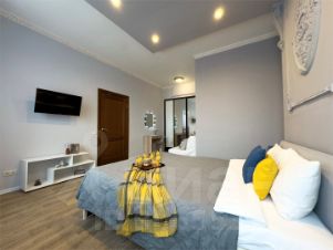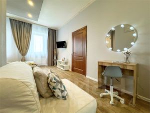 В спальне установлено гримерное зеркало, большой шкаф-купе, удобная двухспальная кровать, плазменный телевизор.