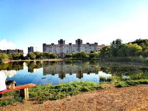 Рядом Сад Фомина с озером и скамейками, где можно погулять и отдохнуть.