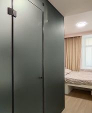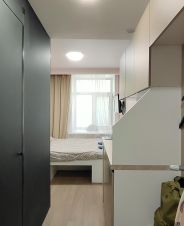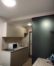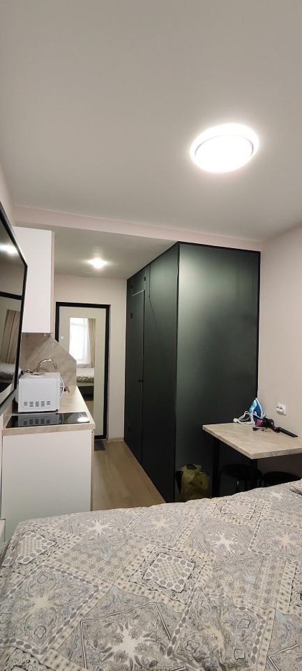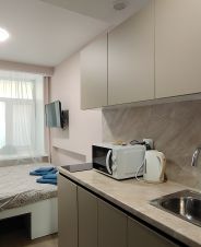 Большая кровать, встроенная кухня, посуда, плита керамическая, печь, эл/чайник, стол, стулья, холодильник, стир/машина, ТВ, интернет.
