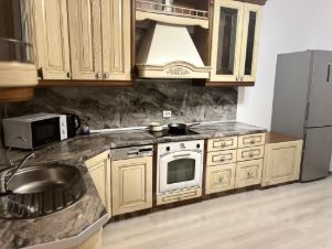 На кухне гарнитур, большой обеденный стол, который размести до 6 гостей, холодильник, посудомоечная машина, варочная, духовой шкаф, 6 комплектов посуды