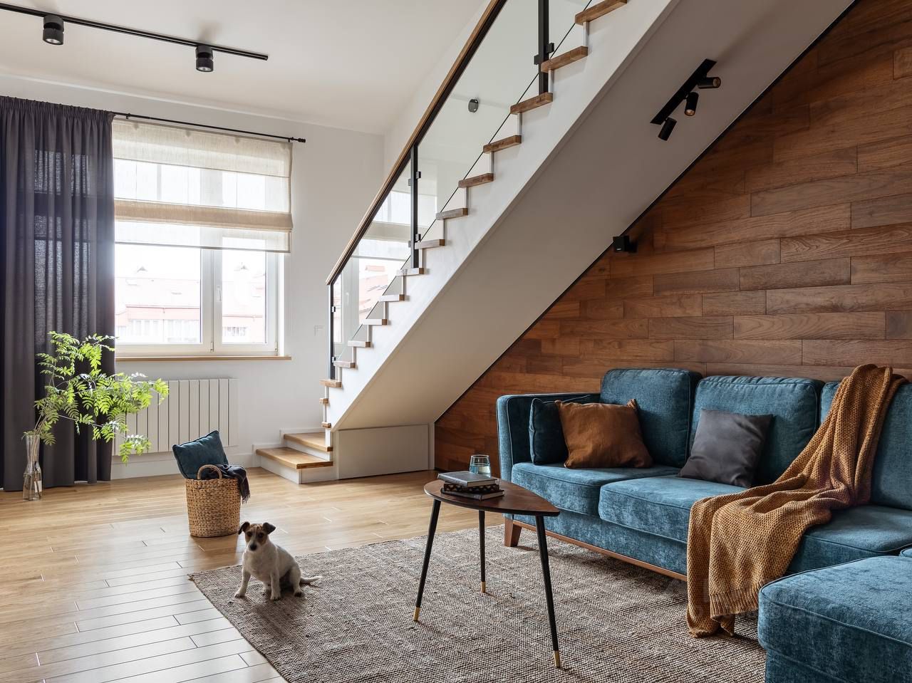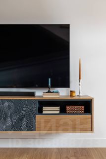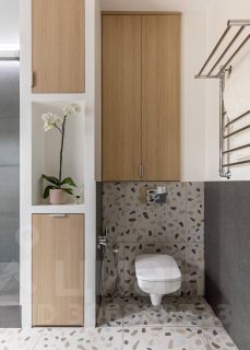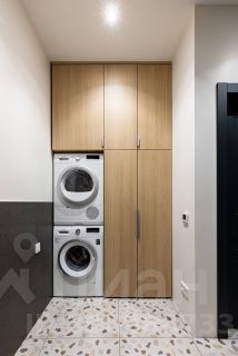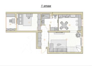 Планировка первого этажа: кухня, оснащенная премиальной техникой, гостиная с натуральным паркетом, детская комната с утепленной лоджией, ванная комната, совмещенная с постирочной.