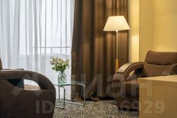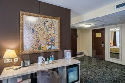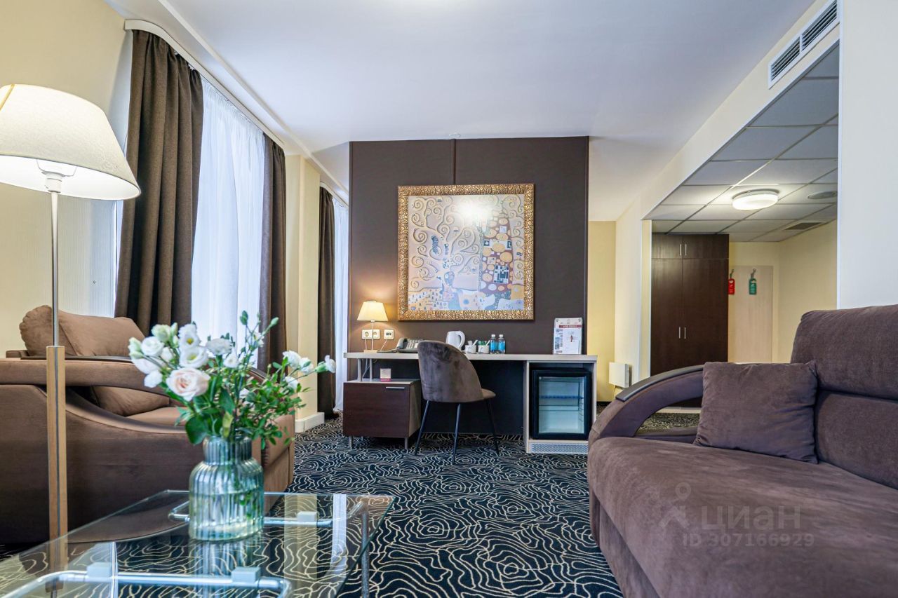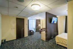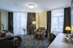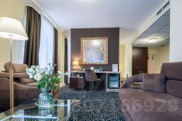 Площадь номера 42 кв.м. В номере кровать, 2 тумбы, рабочий стол, стул, диван (возможно использование как дополнительного спального места), 1 кресло, низкая тумба, малое зеркало, платяной шкаф, зеркало во весь рост, вешалка для верхней одежды с подставкой под багаж, сейф, минибар, ЖК ТВ (спутниковое ТВ), проводной Интернет, ванная, фен, телефон в ванной.
