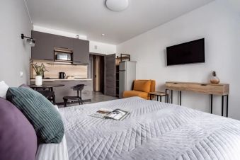 Мы с заботой подошли к оснащению наших квартир, чтобы ваше путешествие оставило только самые теплые воспоминания! Студия представляют собой просторную дизайнерскую квартиру-студию с полноценной кухней, уютным балконом с потрясающим видом на город.