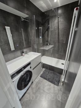 В ванной: итальянская душевая, раковина с тумбой и интегрированной стиральной машиной.