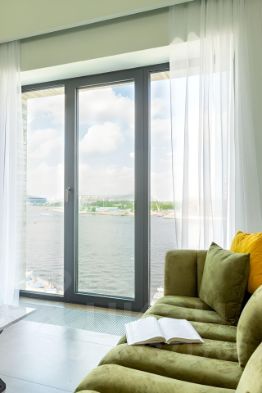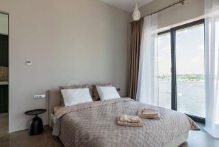 Новые Апартаменты с дизайнерским ремонтом в лофт-квартале Docklands с видом на Лахта Центр, стадион Газпром Арена, Неву и Финский залив.