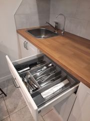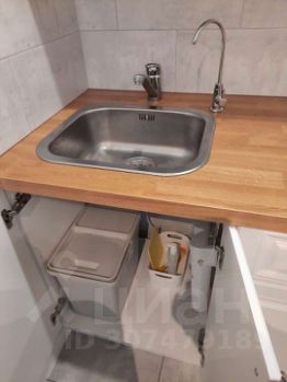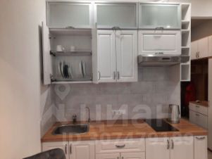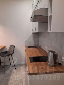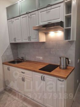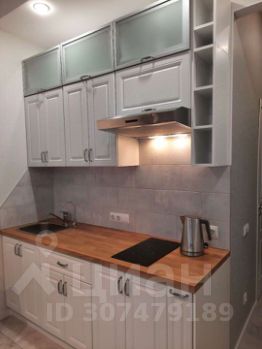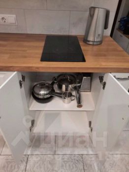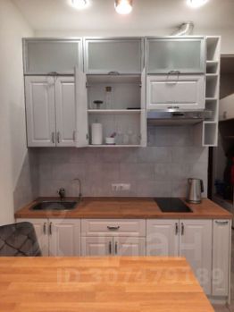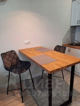 Встроенная кухня с керамической варочной панелью, вытяжкой, 2- камерным холодильником, Свч, чайником, посудой. Установлен фильтр очистки воды. Барный стол и 2 высоких мягких стула.