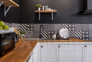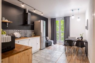 Полностью оборудованная кухня (холодильник, посудомоечная машина , варочная панель, электрический чайник, СВЧ печь).