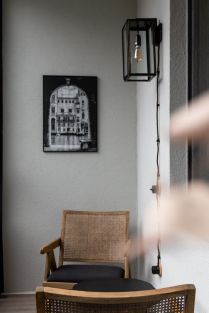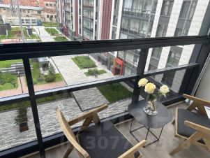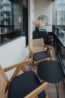 - Просторная лоджия с французскими креслами и видом на спокойный, современный двор.