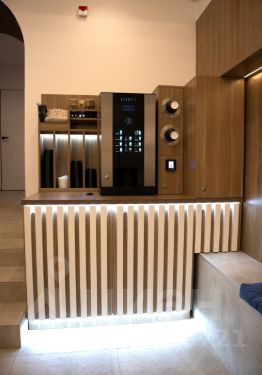 На первом этаже комплекса расположена зона с просторной гостиной, где вы можете расслабиться на диване и насладится ароматным кофе, который можно приобрести не выходя из гостиной.