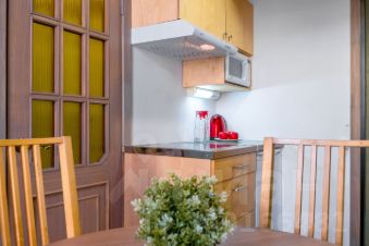 - Coбcтвeннaя кухня (электроплита, xoлодильник, электрический чайник, посуда для приготовления пищи, обеденный стол)