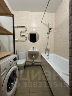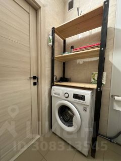 В ванной комнате стиральная машина, фен, отпариватель для одежды.