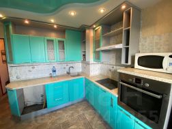 На кухне (10м) - встроенная кухонная мебель с варочной панелью, вытяжкой, духовым шкафом и холодильником. На кухне есть двуспальный диван и второй застекленный балкон. Есть место для встроенной посудомоечной машины.