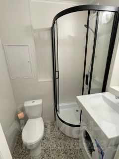 Кухонный гарнитур с барной стойкой и стульями, индукционная варочная панель, вытяжка, холодильник , стиральная машинка, раскладной двуспальный диван , в коридоре большой вместительный шкаф.