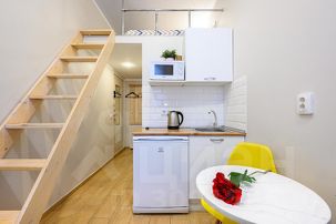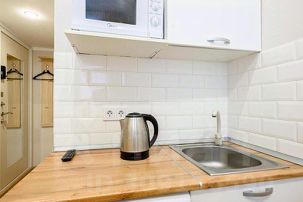 — Мини кухня: чайник, микроволновая печь, холодильник, электрическая плита, столовые приборы, посуда;