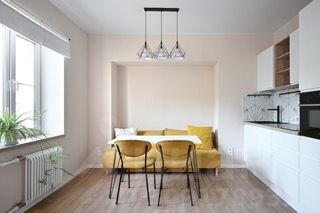 Кухня- гостиная - большое светлое пространство, где можно завтракать, обедать и также использовать диван как спальное место.