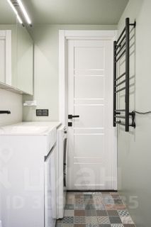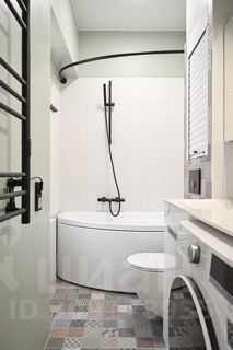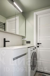 Современная ванная комната с сантехникой премиум класса и стиральной машиной.