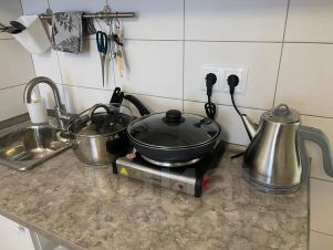 Гостям предлагается размещение в студии с телевизором с плоским экраном, очень удобная кровать "ИКЕА", кухонный гарнитур, стол обеденный, стулья, светильник, электроплита! Холодильник, микроволновка, чайник, шкаф, комод. Вся необходимая посуда, столовые приборы и домашняя утварь, фен. В ванной комнате находится душ, раковина, туалет. Установлена стиральная машина-автомат, утюг и гладильная доска.