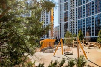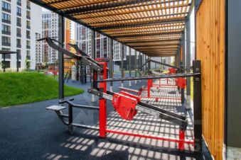Закрытый двор с множеством детских площадок и профессиональными тренажерами для спорта!