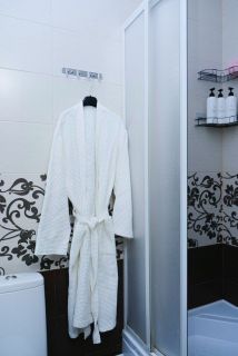 Совмещенный санузел с душем, мягкими полотенцами и гигиеническими принадлежностями.