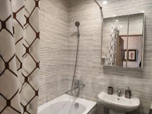 Апартаменты оснащены всей необходимой мебелью для долгосрочного проживания. Хороший современный ремонт. В спальне 2 отдельные кровати 90х200 см с ортопедическими матрасами Аскона, кресла, вместительный шкаф. Шторы блэкаут. На кухне кроме обеденной зоны есть удобный спальный диван для двоих человек. Вся необходимая техника, преимущественно Bosch (варочная поверхность с вытяжкой, духовой шкаф, посудомоечная и стиральная машины, микроволновая печь, холодильник, телевизор, чайник, тостер, утюг). Посуда и приборы. Санузел совмещенный. Лоджия с креслами и столиком.
