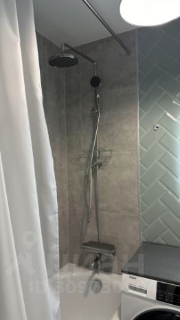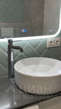 Ванная оборудована зеркалом с подсветкой и смесителем с термостатом, тропическим душем.