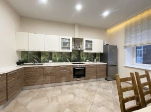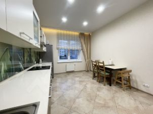 Квартира двусторонняя с большой кухней-гостиной, просторными комнатами и высокими потолками (3 метра) и двумя санузлами.