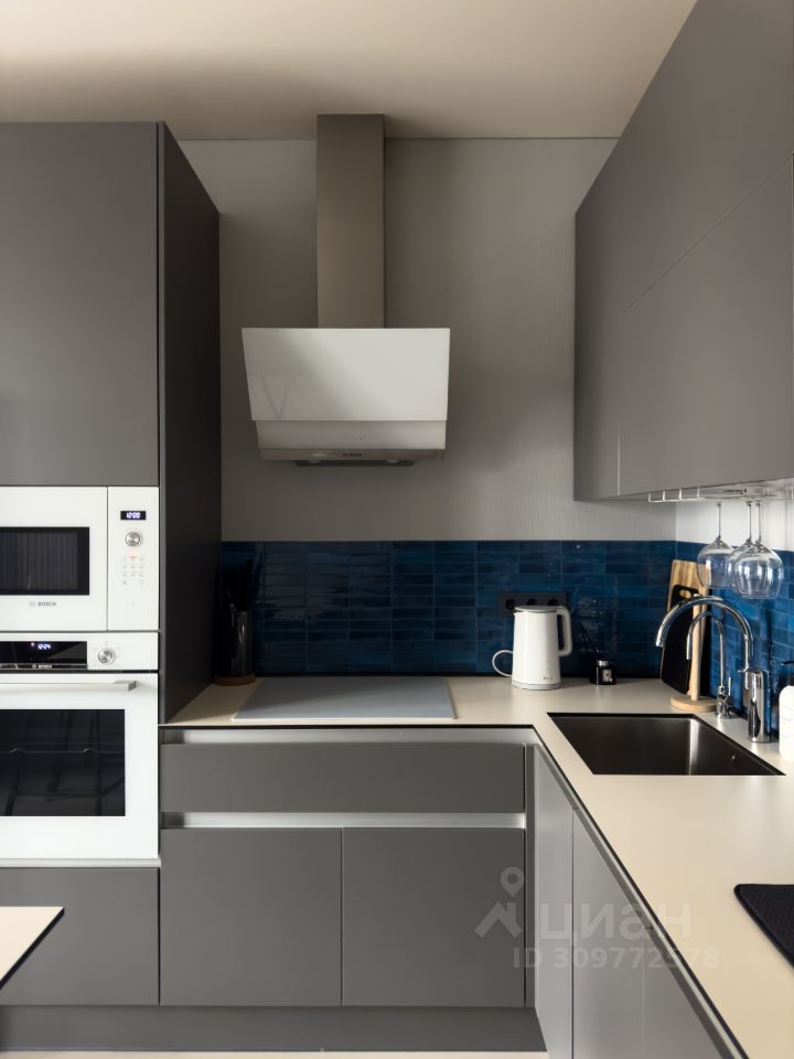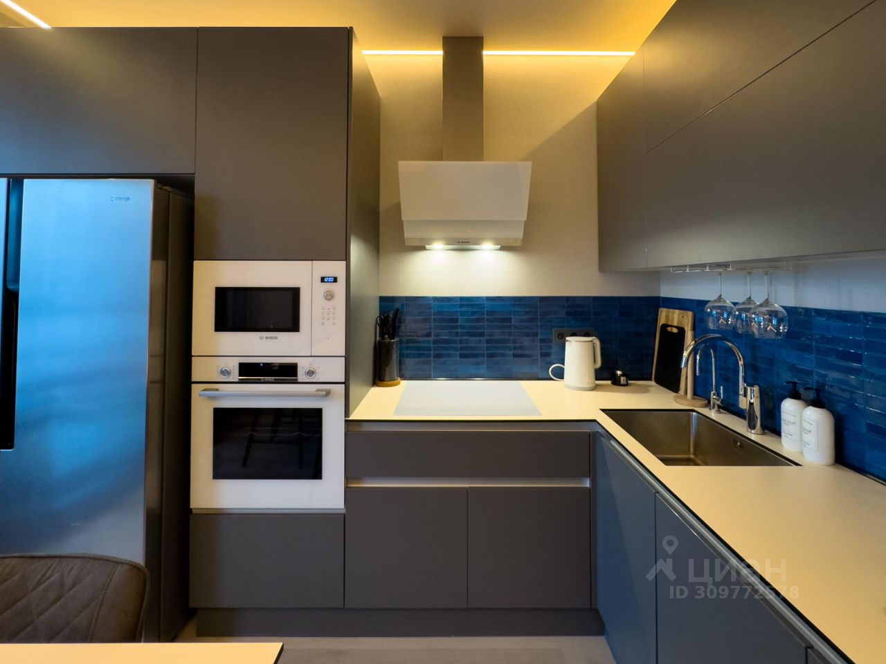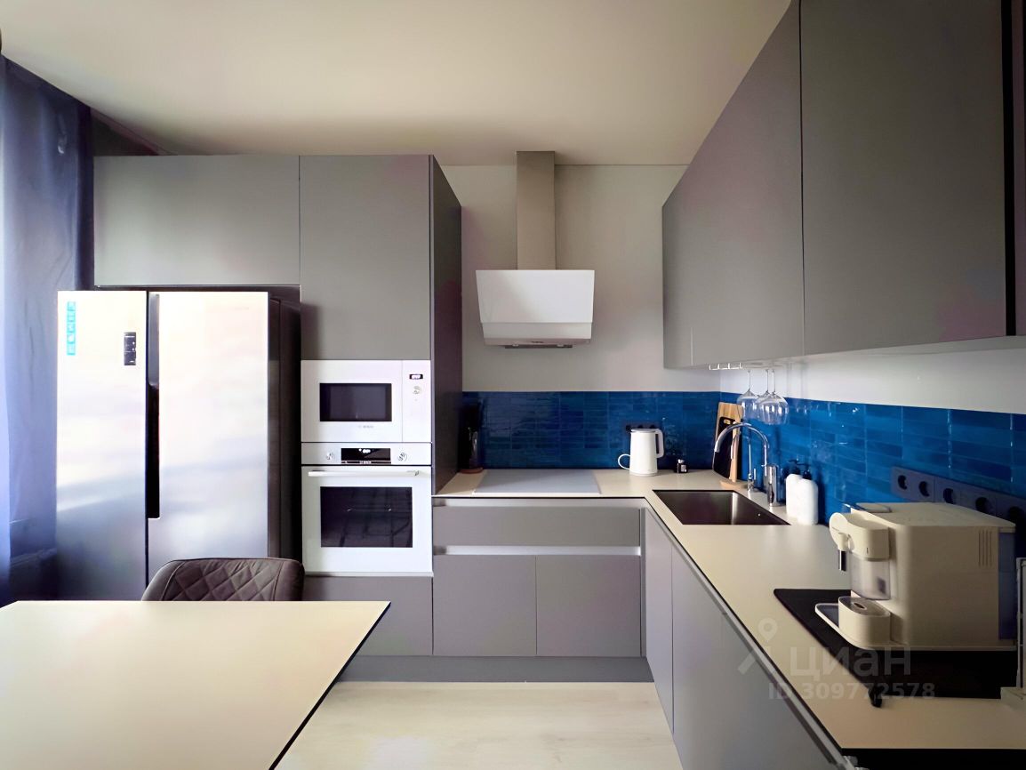 3. Кухня с большим кухонным гарнитуром и такой встроенной бытовой техникой как - посудомоечная машина Bosch, встроенная микроволновая печь Bosch, встроенный духовой шкаф Bosch, варочная панель gorenje и вытяжка Bosch, двухкамерный большой холодильник, чайник, кофемашина Nespresso, есть посуда красивая. Функцию стола выполняет остров с встроенными местами хранения, стулья полубарные, комфортной высоты. Красивое искусственное освещение с разными сценариями.