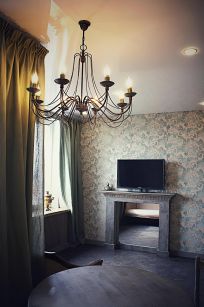 вытяжкой, варочной поверхностью, духовым шкафом в ретро стиле, посудомоечной машиной, холодильником, фритюрницей, соковыжималкой, утюгом, электрочайником, кофеваркой,фильтром для питьевой воды. Красивый фаянсовый комплект посуды на 6 человек и золотые столовые приборы позволят вам наслаждаться не только вкусно приготовленной едой, но и эстетической подачей в красивой посуде. На антикварном диване перед журнальный столиком вы сможите комфортно проводить вечера за интересной книгой или следя за увлекательным сериалом. Качественное постельное белье подобраное по цвету к интерьер и асконовский ортопедический матрас подарят сладкий сон. Мягкие, пушистые полотенца и разные мелочи будут радовать вас при принятии душа или ванны с пеной. Отдельная гардеробная и место хранения под подьемной кроватью предоставят возможность грамотно разместить все вещи.