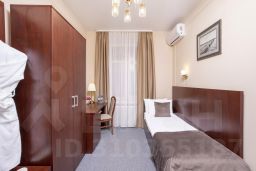 Одноместный номер площадью 12 м², с одноместной кроватью. В номере есть собственный санузел с душевой кабинкой, находящийся вне номера. Кондиционер, Smart телевизор, холодильник, чайник (чайный набор) , шкаф, письменный стол. Гостям предоставляются туалетно-косметические принадлежности и фен. Гостям предоставляются тапочки и халат.