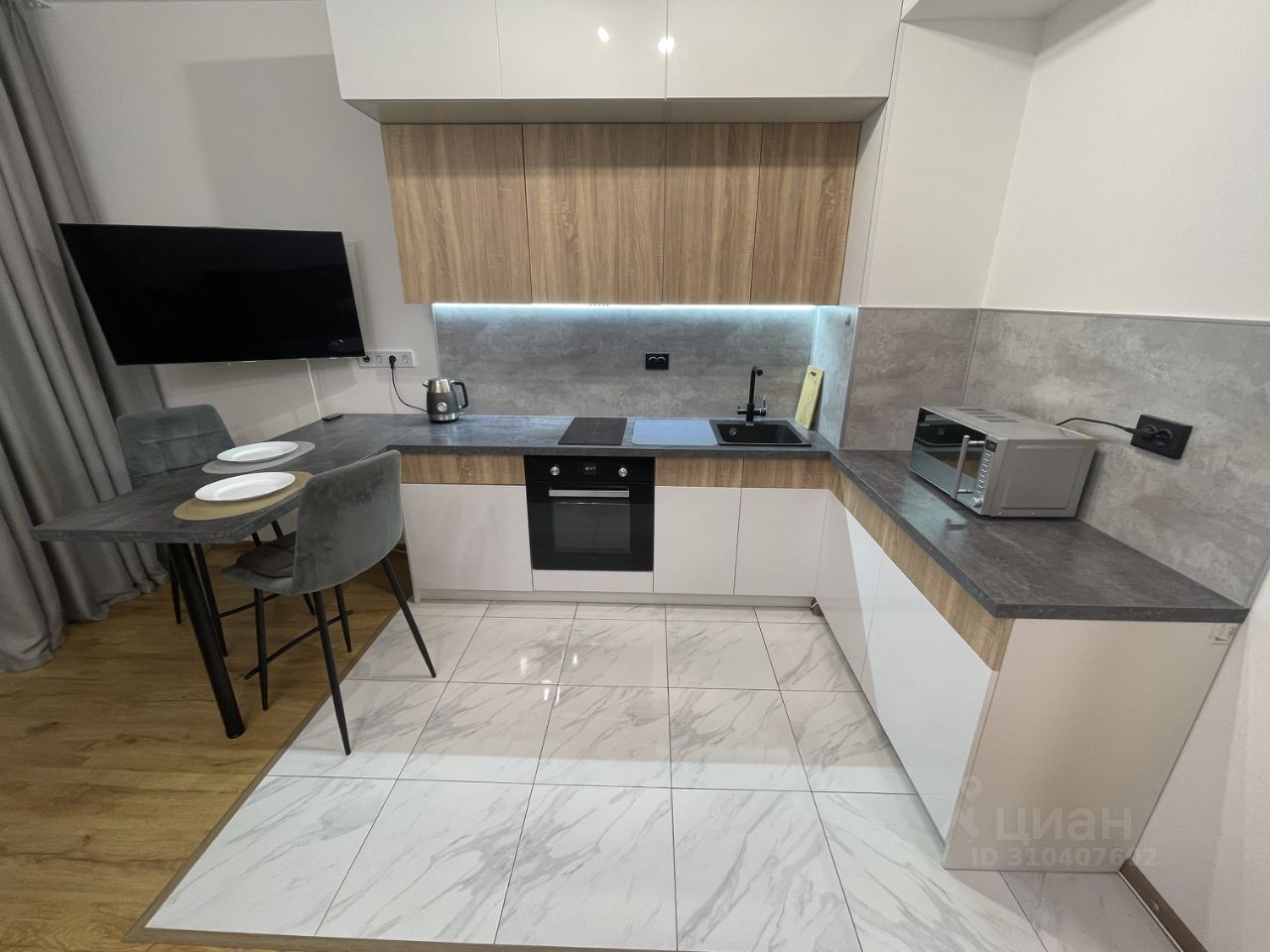 Кухня\спальная: удобный большой раскладывающийся диван. Вместительный холодильник, микроволновая печь, духовой шкаф, варочная поверхность, вытяжка, вместительный кухонный гарнитур.
