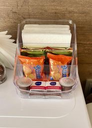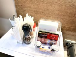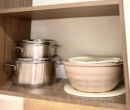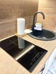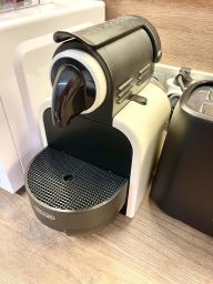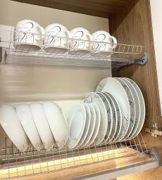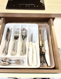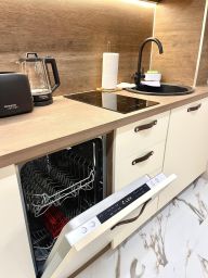 Полноценная кухня — если захотите готовить, есть всё необходимое: индукционная плита, капсульная кофемашина, чайник, тостер, фильтр для питьевой воды и полный набор посуды