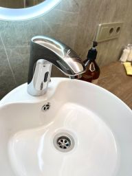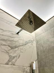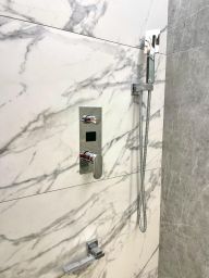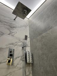 Просторный санузел с тропическим душем, дисплеем и отображением температуры воды