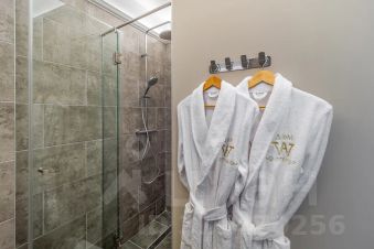 В ванной комнате: душ, туалет, раковина, фен, халаты, тапочки, гель для душа, шампунь, бальзам для волос, мыло для рук, лосьон для тела, зубные наборы, шапочки для душа.