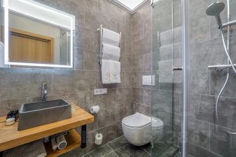 В ванной комнате: душ, туалет, раковина, фен, халаты, тапочки, гель для душа, шампунь, бальзам для волос, мыло для рук, лосьон для тела, зубные наборы, шапочки для душа.