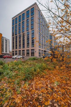Современный комплекс, на первых этажах множество магазинов и кофеен.