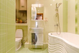 Санузел - совмещенный в кафеле. В джакузи здорово понежиться после трудового дня. Есть бойлер на случай отключения горячей воды, электросушилка. Установлена стиральная машина.