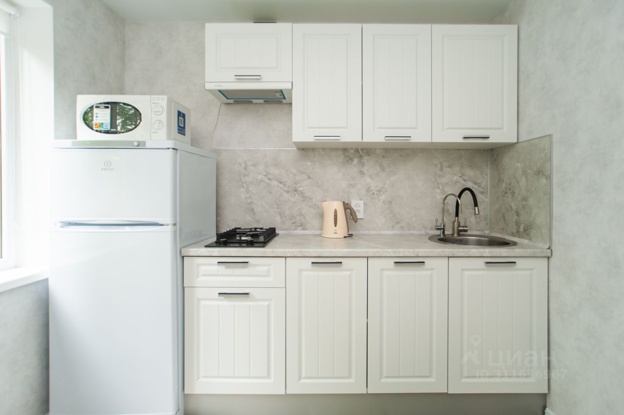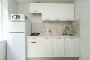- Современная кухня с холодильником и микроволновкой,