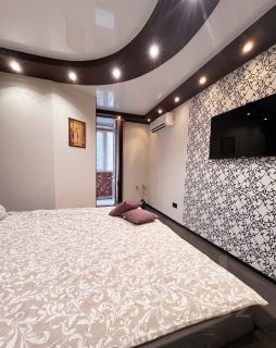 В мастер-спальне : 2х спальная кровать с просторной гардеробной и с возможностью разных сценариев освещения пространства под настроение. ТВ.