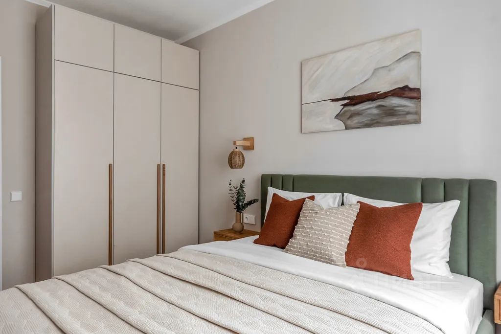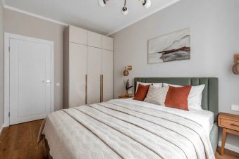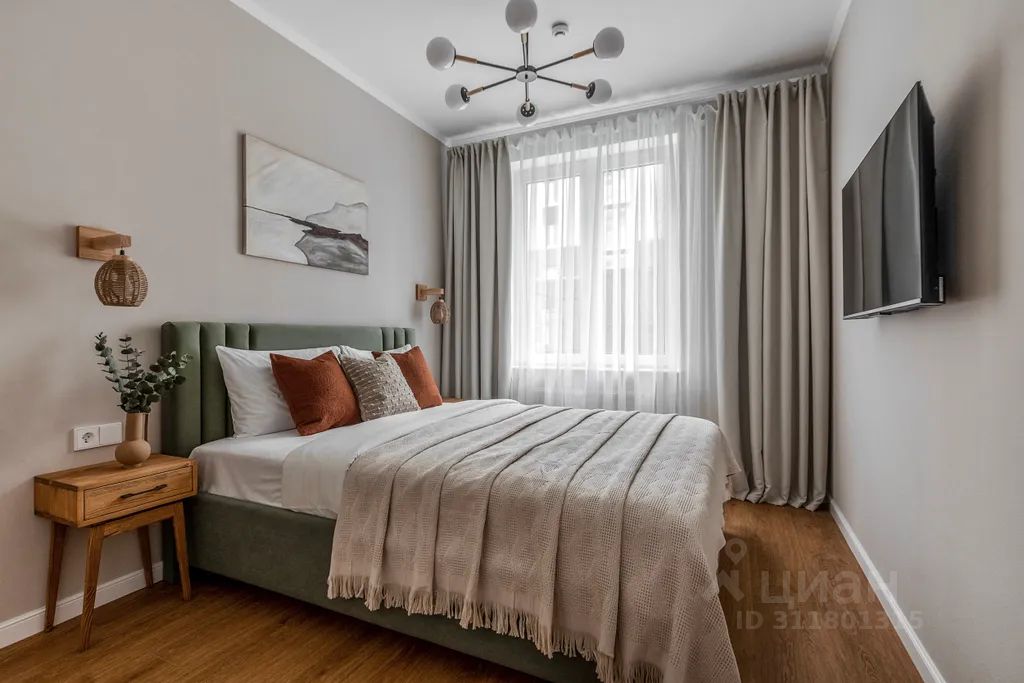В спальне — удобная двуспальная кровать с ортопедическим матрасом; вместительный шкаф для одежды, телевизор со smart-tv.