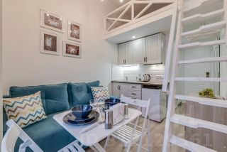 Разделение на гостиную- кухню и спальное место на втором этаже.