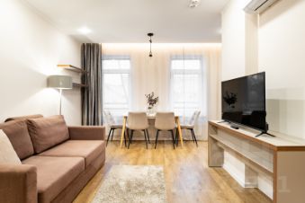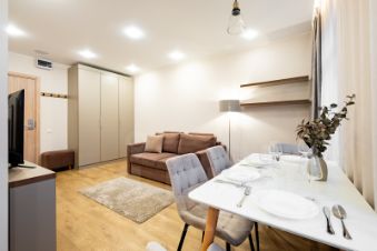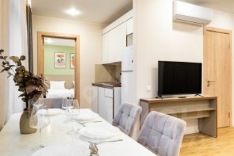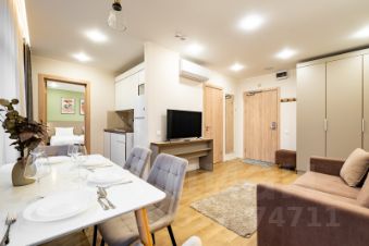 - Вместимость: до 4 гостей, с одной спальней и просторным залом, объединённым с полностью оборудованной кухней.