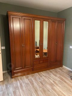 В комнате установлен добротный испанский спальный гарнитур, всё в одном стиле, цвета красного дерева.